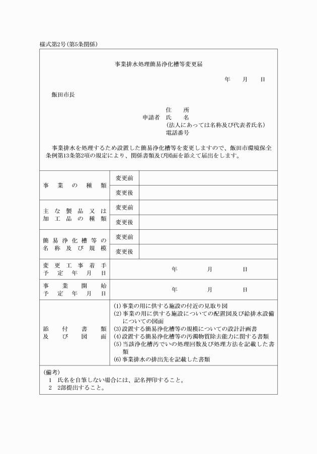 2 環境保全条例の一部を改正する条例(平成5年飯田市条例第14号)附則第4項により事業排水処理簡易浄化槽の設置を市長に届出でなければならない場合は、第10条を準用する。この場合において、同条第1項第4号中「建築工事着手予定年月日」とあるのは「建築工事着手年月日」と、同項第5号中「事業開始予定年月日」とあるのは「事業開始年月日」とそれぞれ読み替えるものとする。