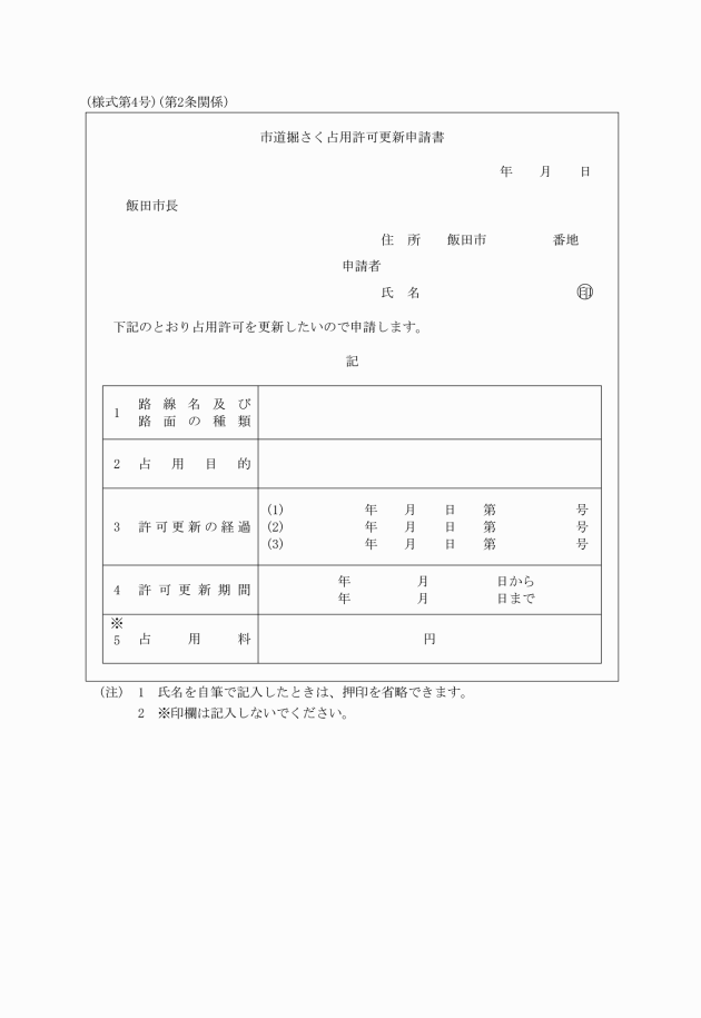 第5条 許可を受けた占用者が占用期間中に特別な事情により第三者に対して当該占用を継承する必要が生じたときは、その理由を付して市長に届け出なければならない。
