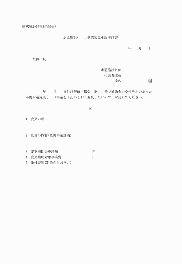 (1) 補助事業の内容を変更しようとするとき 水道施設( )事業変更承認申請書(様式第2号)