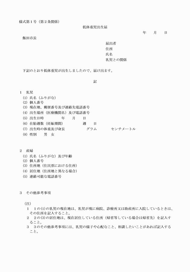 第2条 法第18条の規定による低体重児の届出は、飯田市低体重児出生届(様式第1号)に必要な事項を記載して市長に提出することによるほか、飯田市低体重児出生届に記載すべき事項を電話その他の手段により市長に伝えることにより行うものとする。