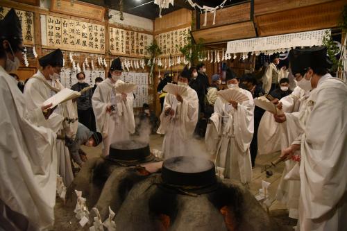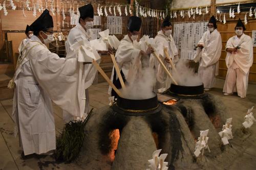 禰宜2人が竃の正面に立ち、湯を汲んだ柄杓と祓い幣を持ち、神送り(神返し)を東南西北中央で唱和して終わります。