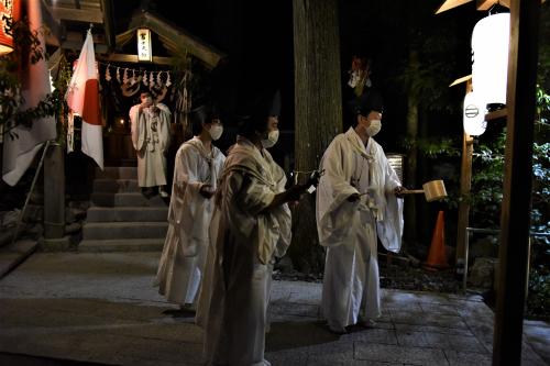 後列の禰宜らが座を立ち、大宮清めの神楽をうたいながら神社の各場所をまわり、祓幣を振り塩をまいて清めます。