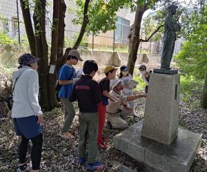 松根油採取場所見学の様子 爆弾三勇士の石像の見学の様子
