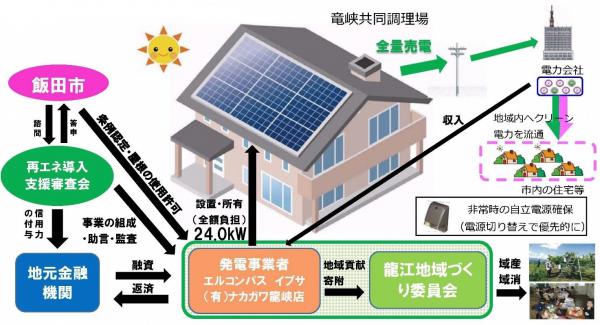 今回、龍江地域づくり委員会(以下「委員会」)とエルコンパス・イプサ 有限会社ナカガワ龍峡店(以下「エルコンパス」)との協働により行われる、竜峡共同調理場の屋根を利用した太陽光発電事業が、本条例による「地域公共再生可能エネルギー活用事業」の第14号事業として認定され、令和2年1月24日に認定証授与・協定書調印式が行われました。